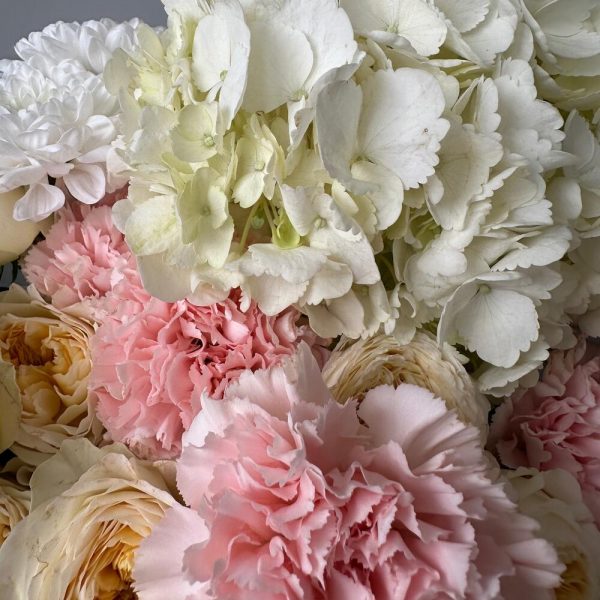 Нежный объемный букет из пионовидных роз, гортензия, диантусов и хризантем станет прекрасным подарком для любого повода.